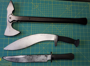 Comparing speed and power between the Bowie, the Kukri and the Tomahawk. 8 videos with text. Tools used in this essay: Cold Steel Leatherneck Bowie, Laredo Rubber Trainer, Gurkha Plus Kukri, Rubber Kukri Trainer, Trail Hawk and an Axe Head Cane cut down to the length of a Trail Hawk. -